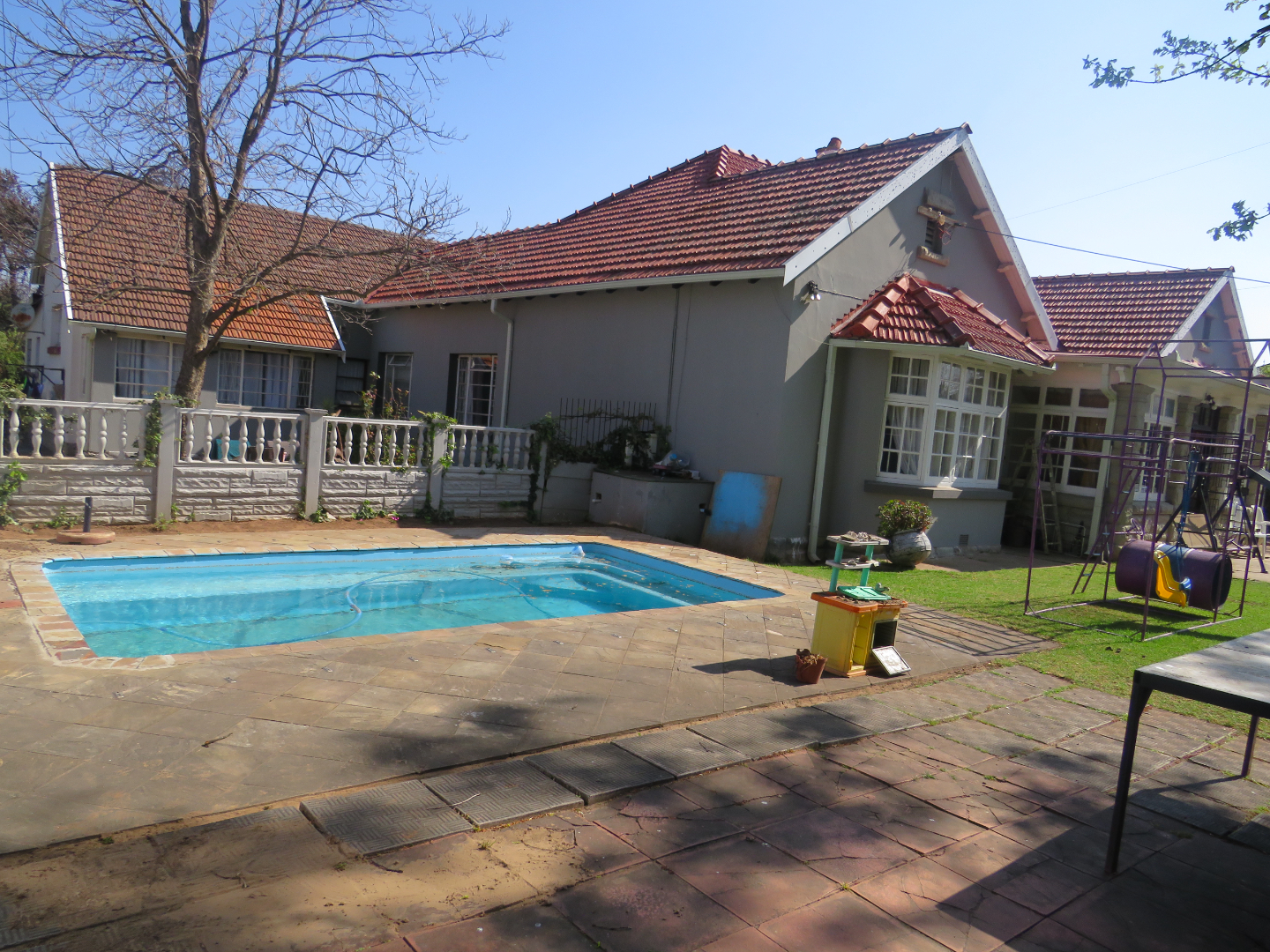 Picture yourself living in a spacious 6-bedroom property with built-in cupboards, a lounge, dining room, kitchen, parking space for 3 cars, 4 bathrooms, and a well-maintained pool for relaxation. The flats on the property have the potential to provide extra income and the proximity to schools in the area is a bonus. You are within walking distance of a supermarket and convenience stores.