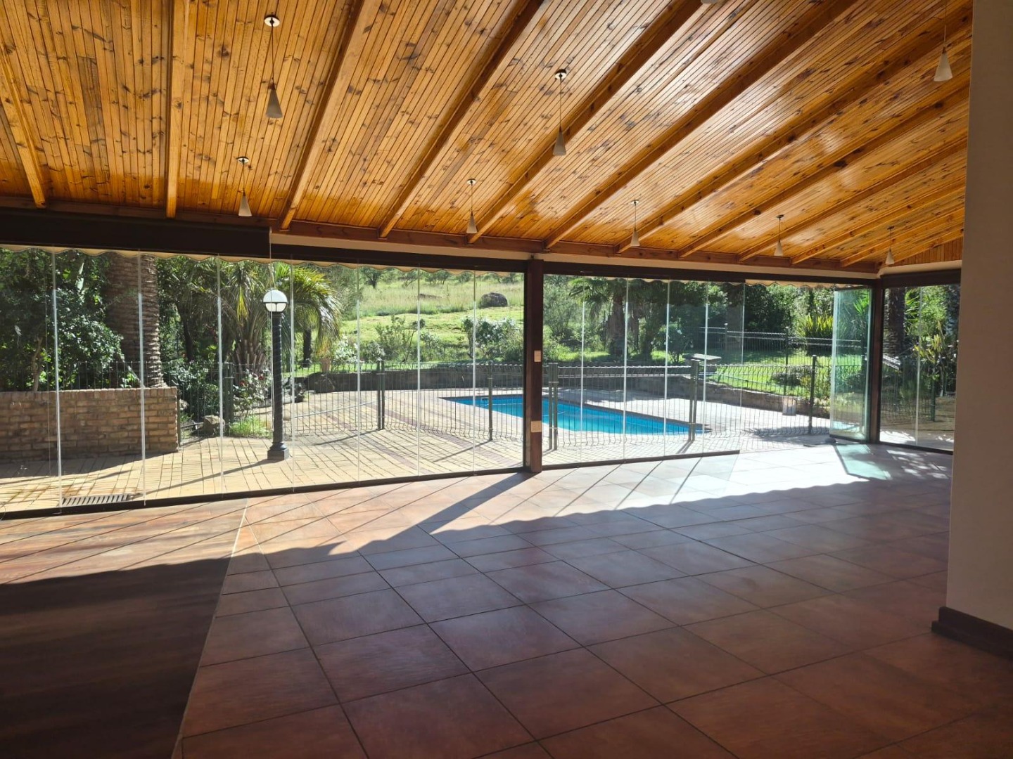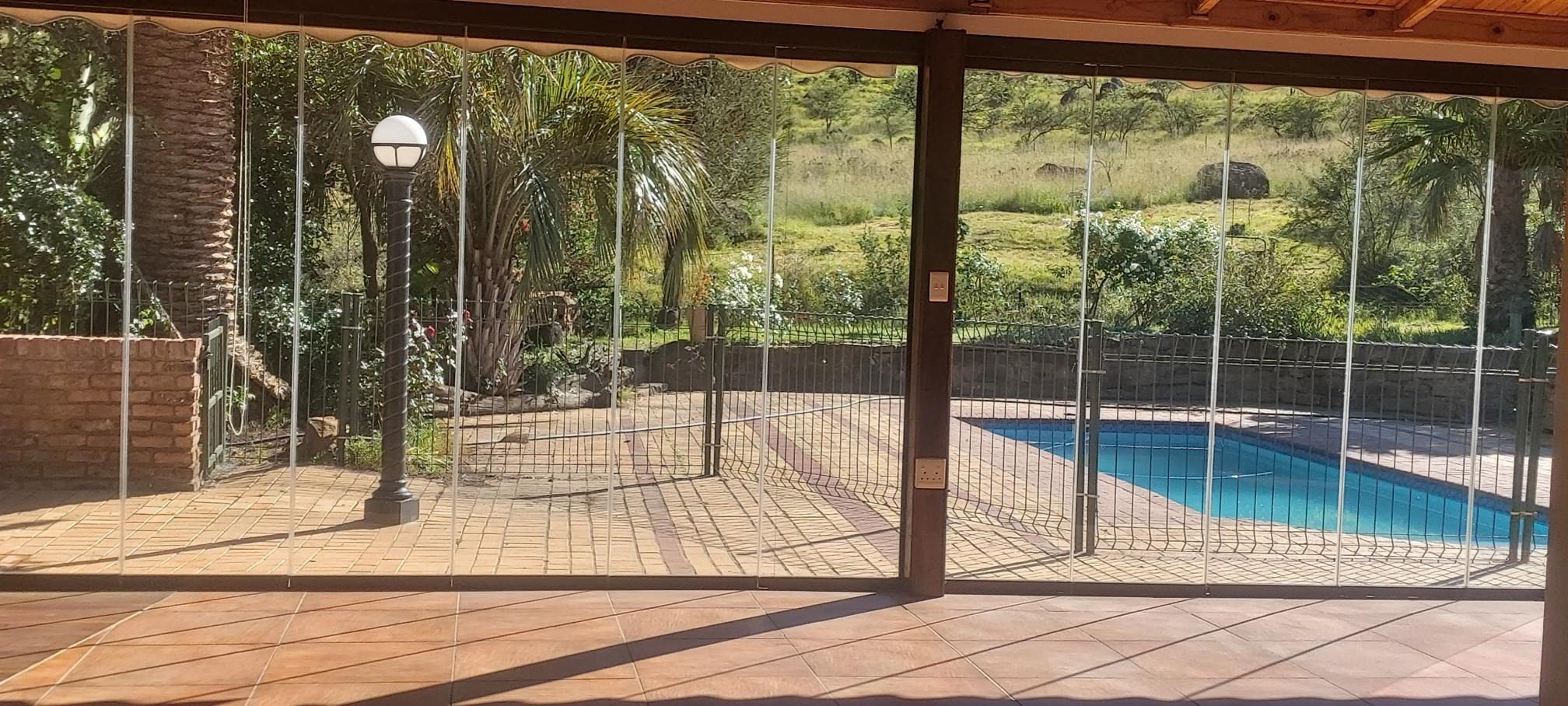 Outdoor living is equally impressive, with a refreshing swimming pool perfect for warm days and a beautifully maintained garden that complements the natural surroundings. Practical features such as a single garage, additional parking, a borehole, water tanks, and an irrigation system enhance convenience and sustainability. Security is well-addressed with an alarm system, fencing, and a security gate, offering peace of mind.